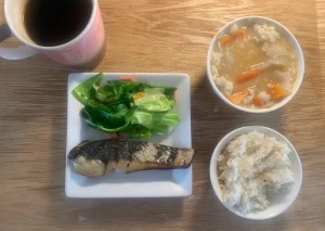 干しサワラ、キャベツとハムのオイル蒸し、鶏団子汁、玄米。お茶はほうじ茶。上手にごはんがつくれて嬉しかったので写真を撮った。美味しかった。