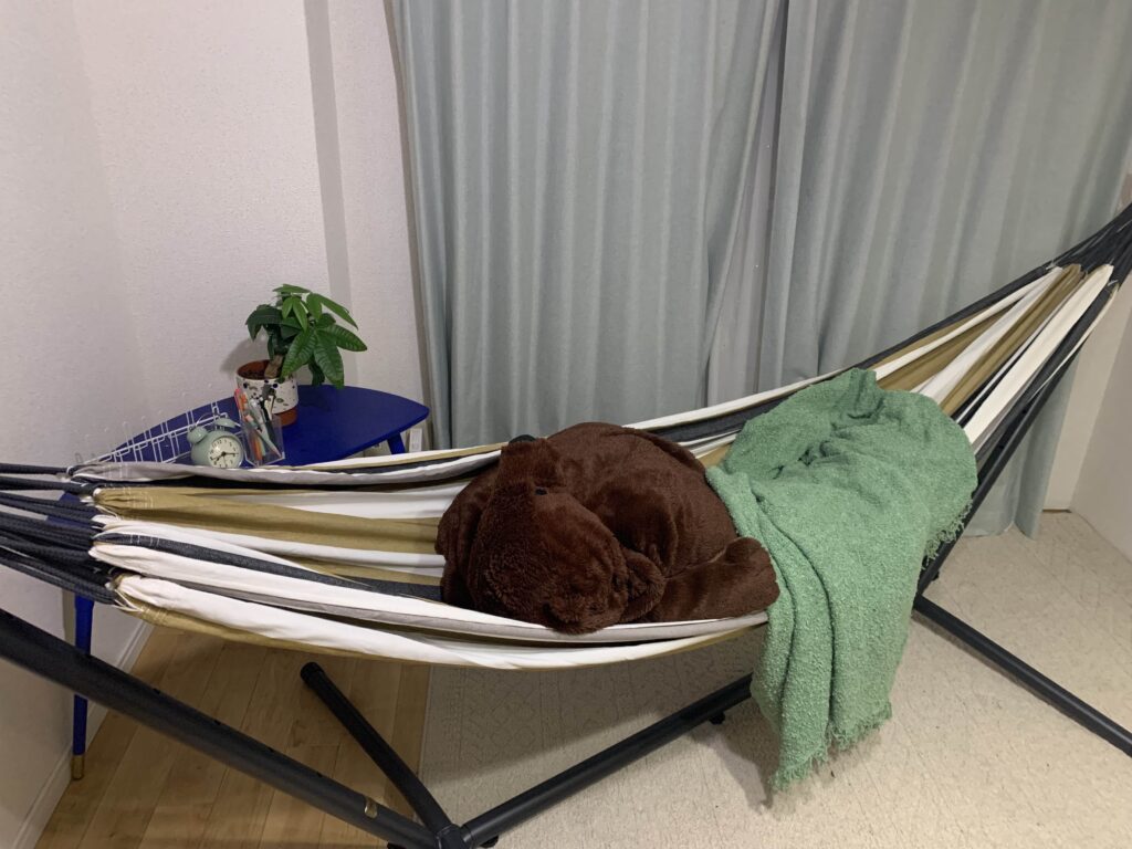 写真上でハンモックを堪能しているのはIKEAのクマのぬいぐるみ。