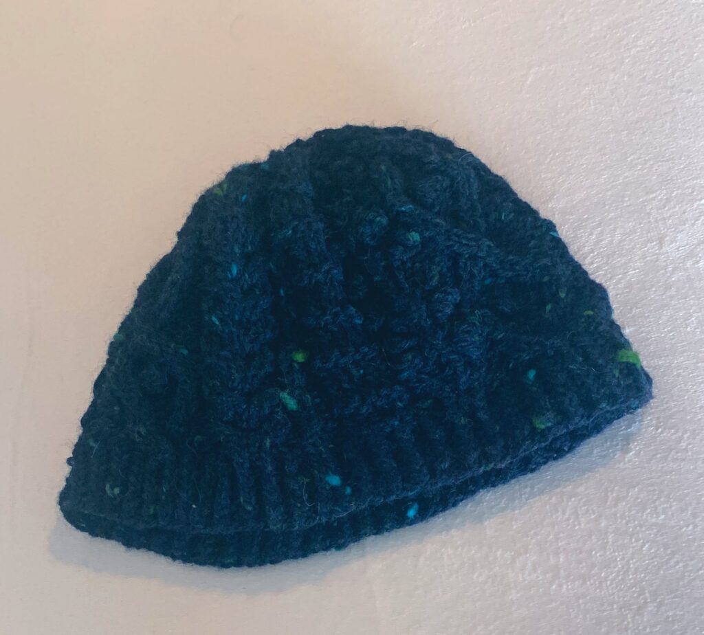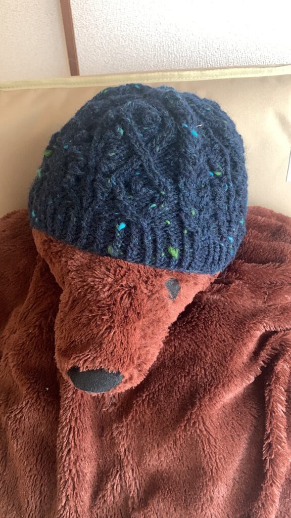 ニットキャップが編み上がった。大体12時間くらい。4時間ずつ編んで3日。2時間ずつ編んでても1週間かからないと思うと簡単だ。