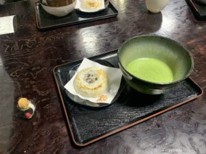 そのまま奥まで進んで、お抹茶といっしょに梅ヶ枝餅をいただいた。