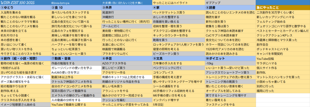 WISHリストは100%を目指すというより、去年の自分との価値観が違うところ、差分、などを確認する方法として便利だと思う。今年沖縄に行くつもりだったこと、実写や3Dの動画ではなくアニメーションをちょっとやりたいと思っていたこと、今年ほとんど絵をかかなかったこと、編み物を思ったよりたくさんやり、小説を思ったよりたくさん書いたこと、全然体重が減っていないどころかどこかの時点でダイエット自体ギブアップ気味であったこと、などがわかる。家でやるトレーニングくらい増やしたらいいのに……。